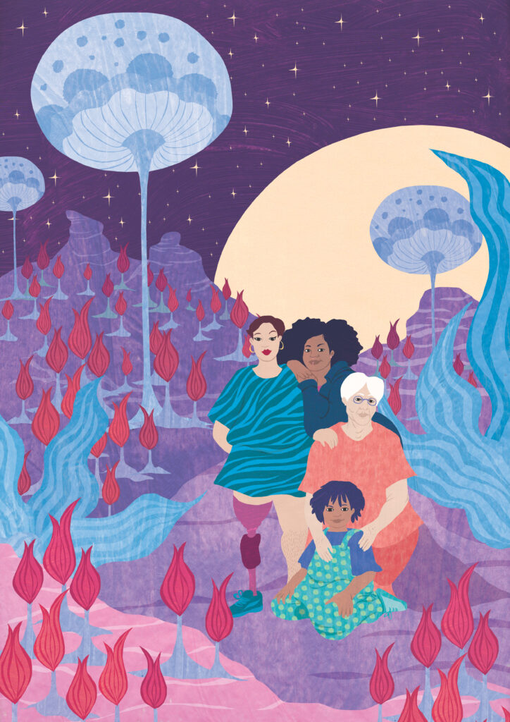 Je crée des univers immersifs, colorés et pleins d’espoir pour plus de justice sociale. J’aborde les thématiques féministes, LGBTQIA+, la santé mentale, les parentalités, les enjeux climatiques et de justice sociale en général.